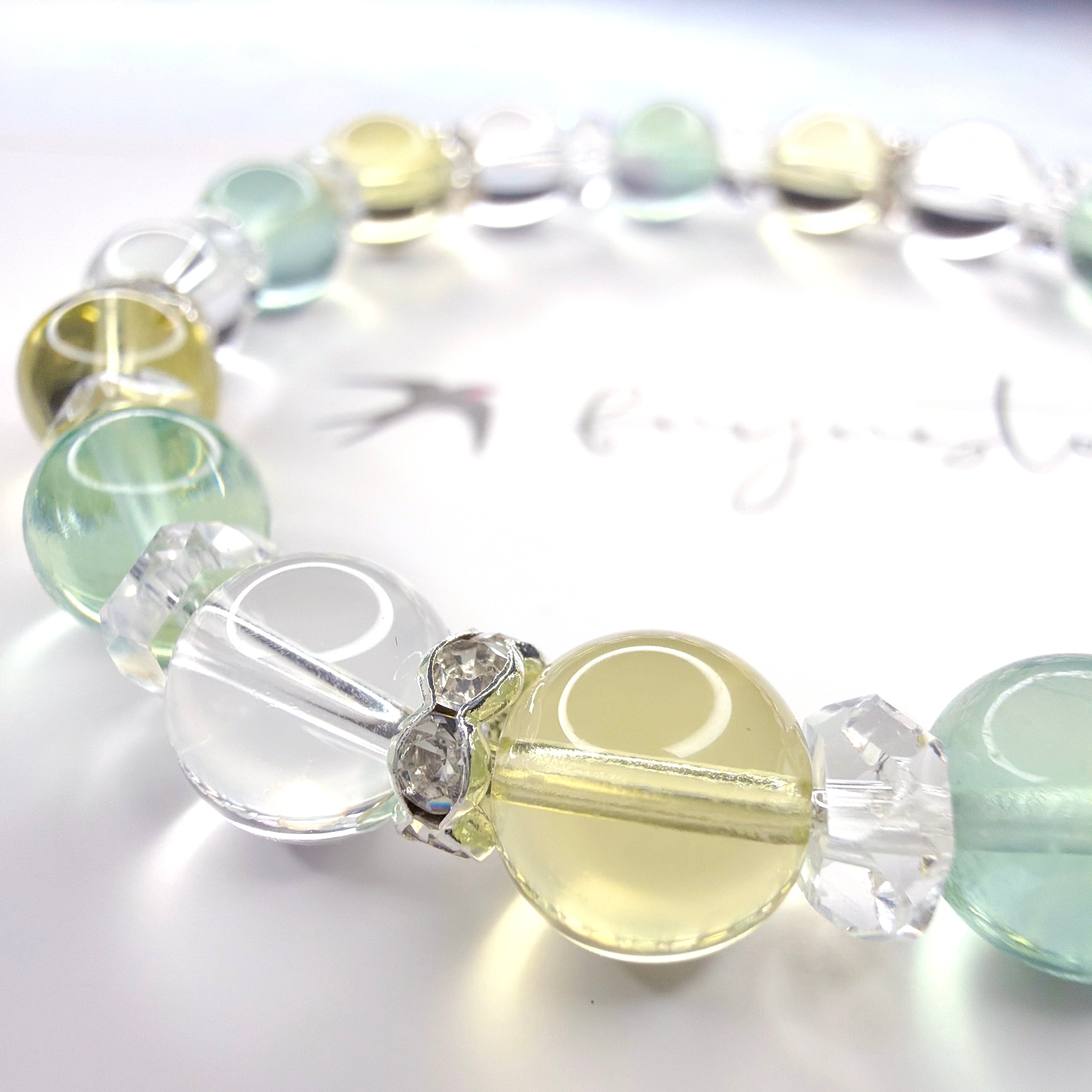 レモンクォーツとブルーグリーンフローライトの組み合わせにより、精神の混乱や不安を抑え、コミュニケーションを円滑にする効果が高まります。