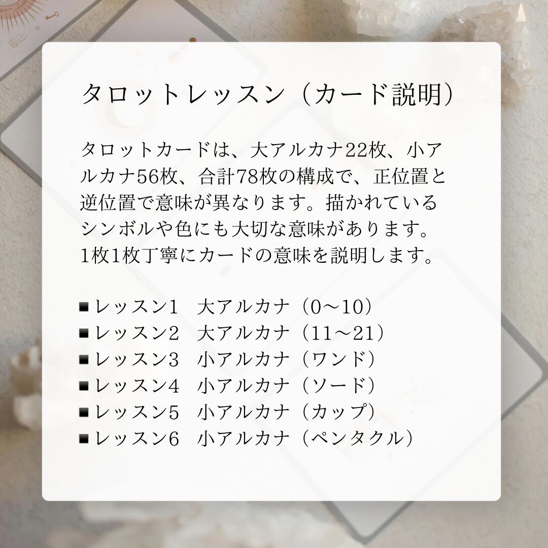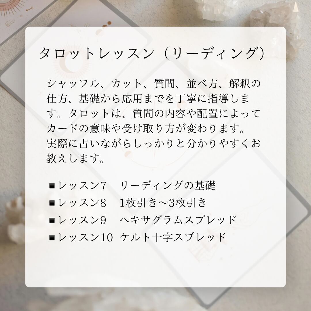 初めての方には、カードの扱い方や基本的な考え方から丁寧に。経験のある方には、リーディングの精度や表現力を高める実践的な内容を。