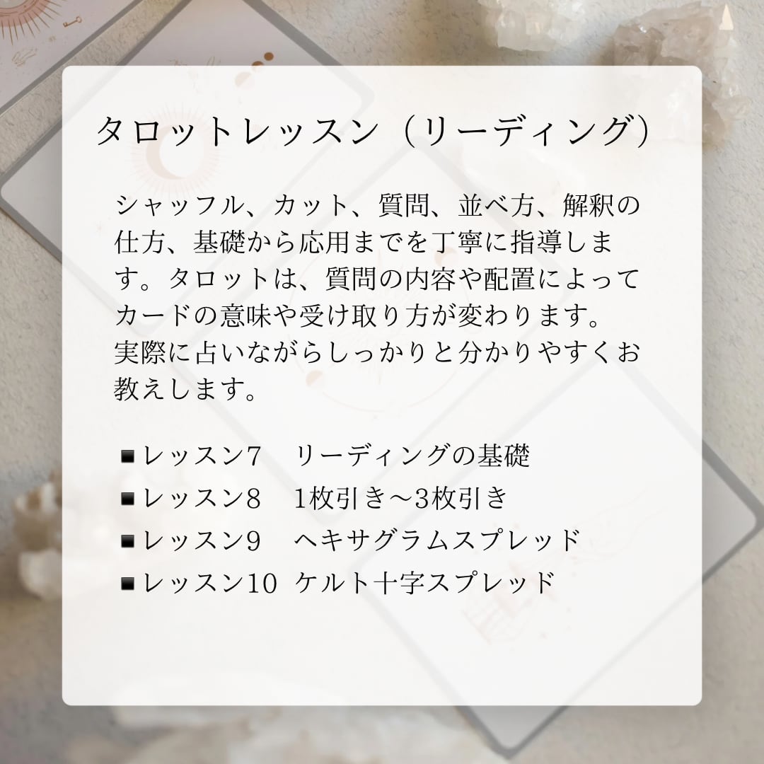 リーディングの基礎は、シャッフル、質問、並べ方についてレッスンします。初めての方には、カードの取り扱いから丁寧にお教えします。