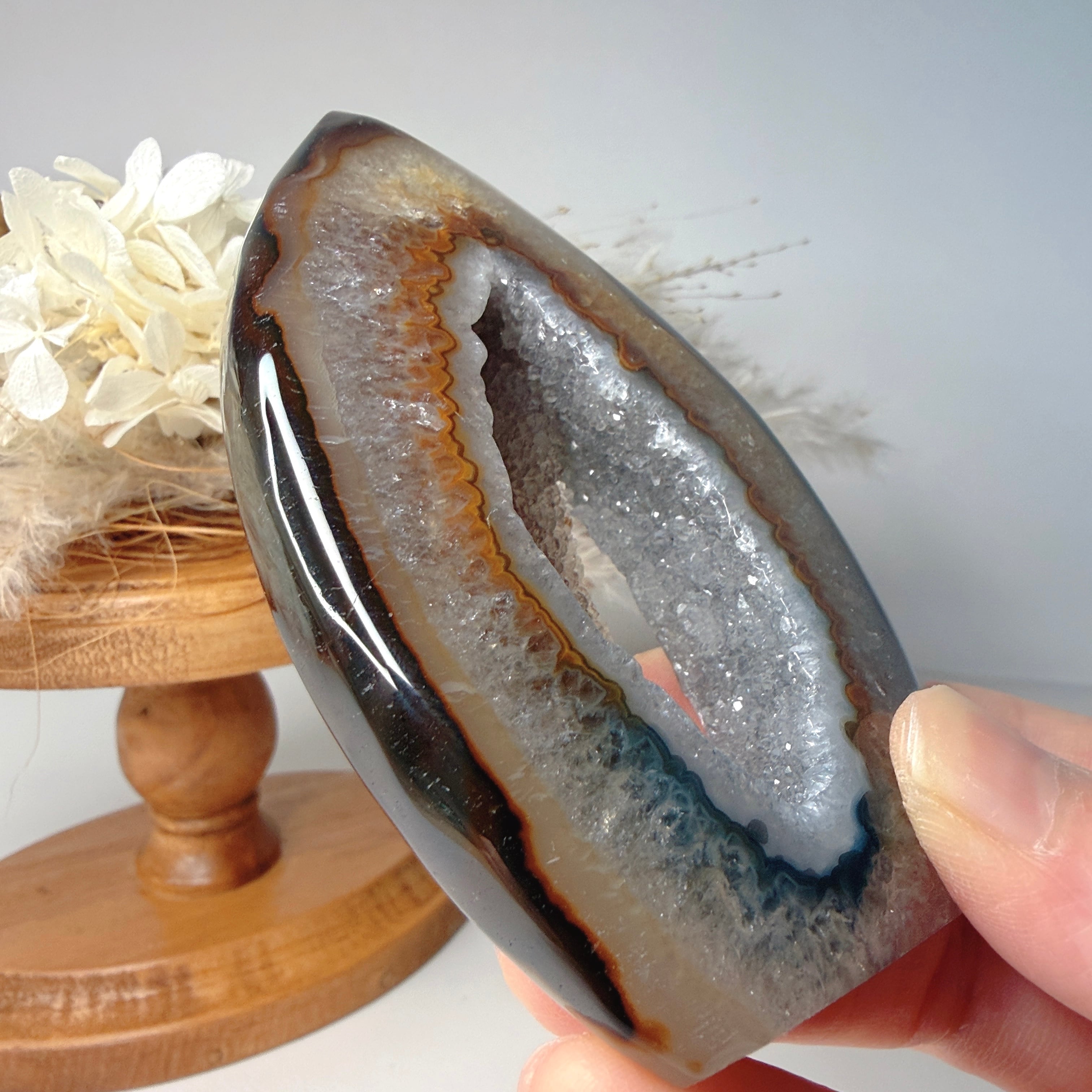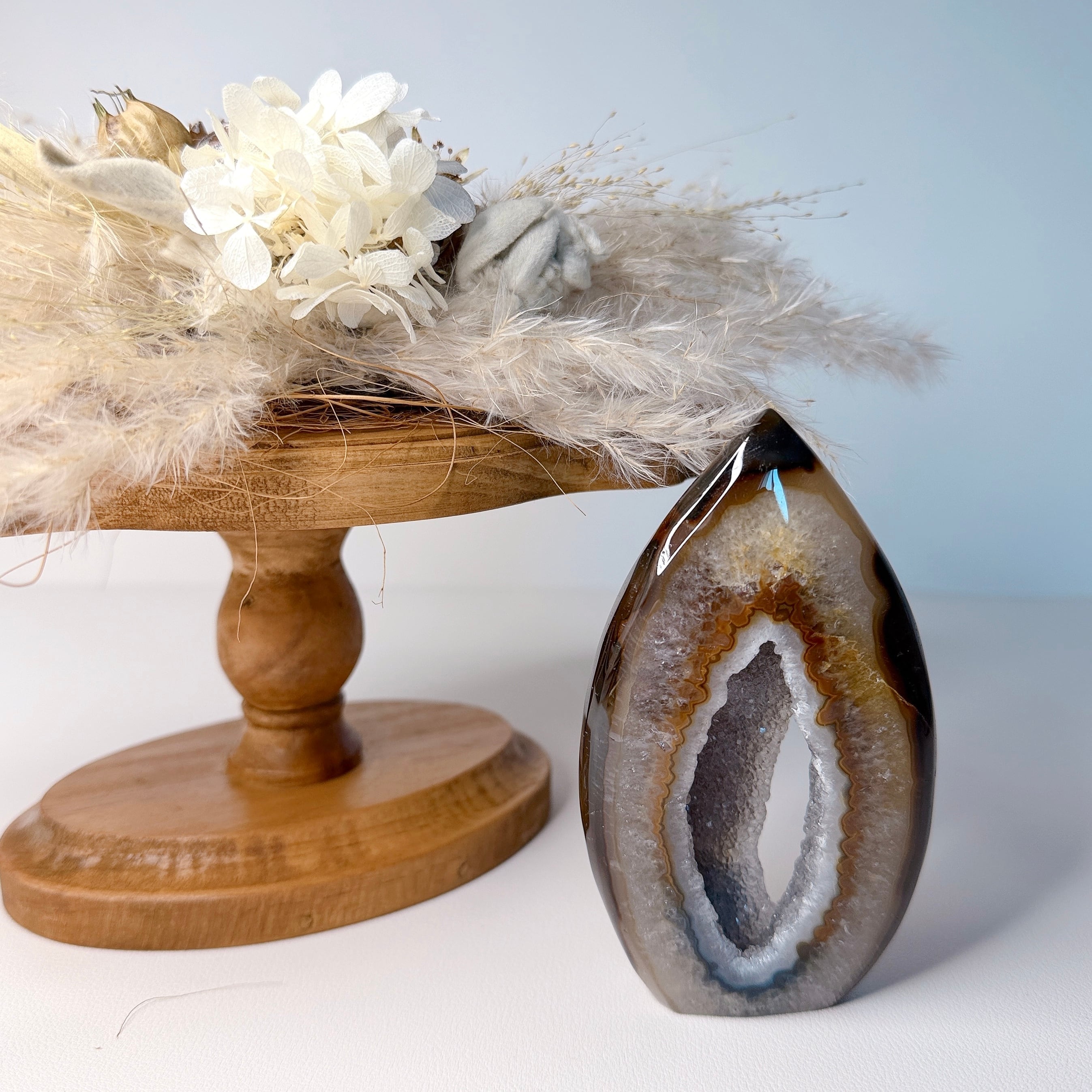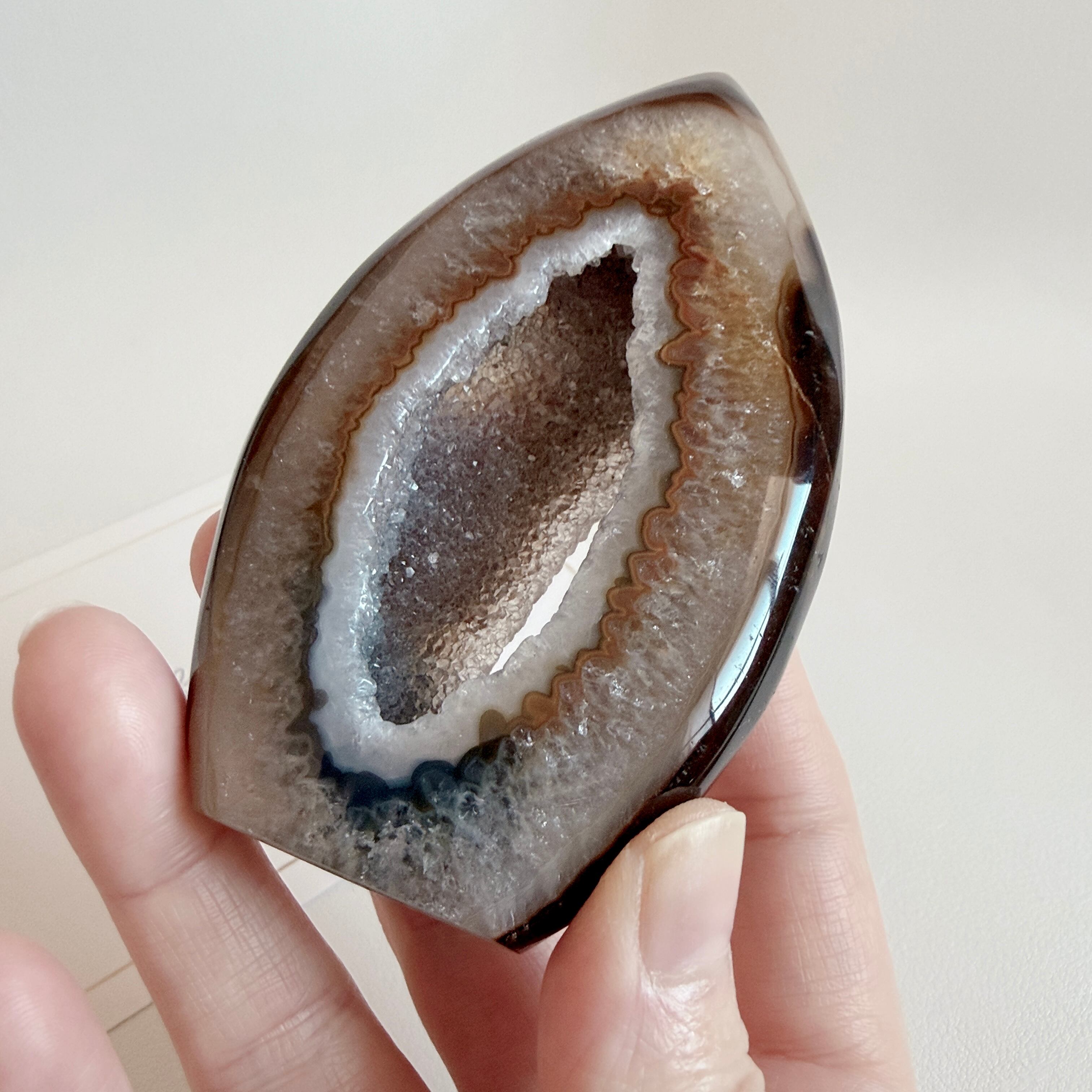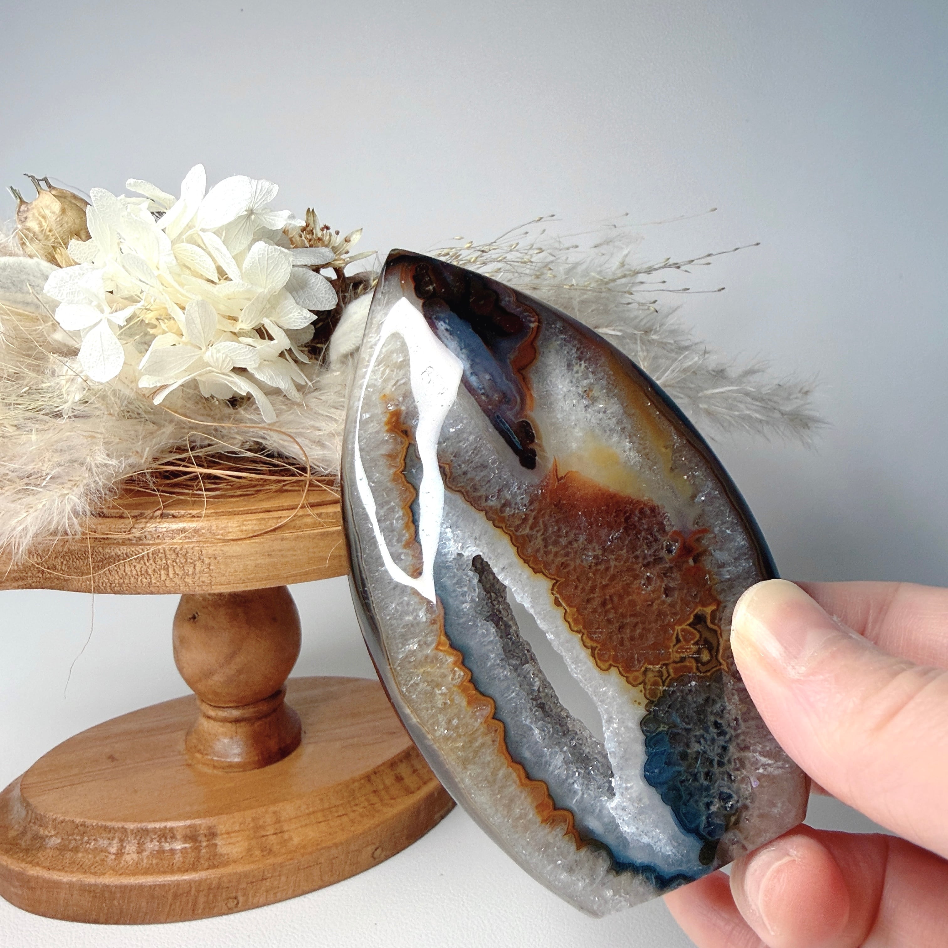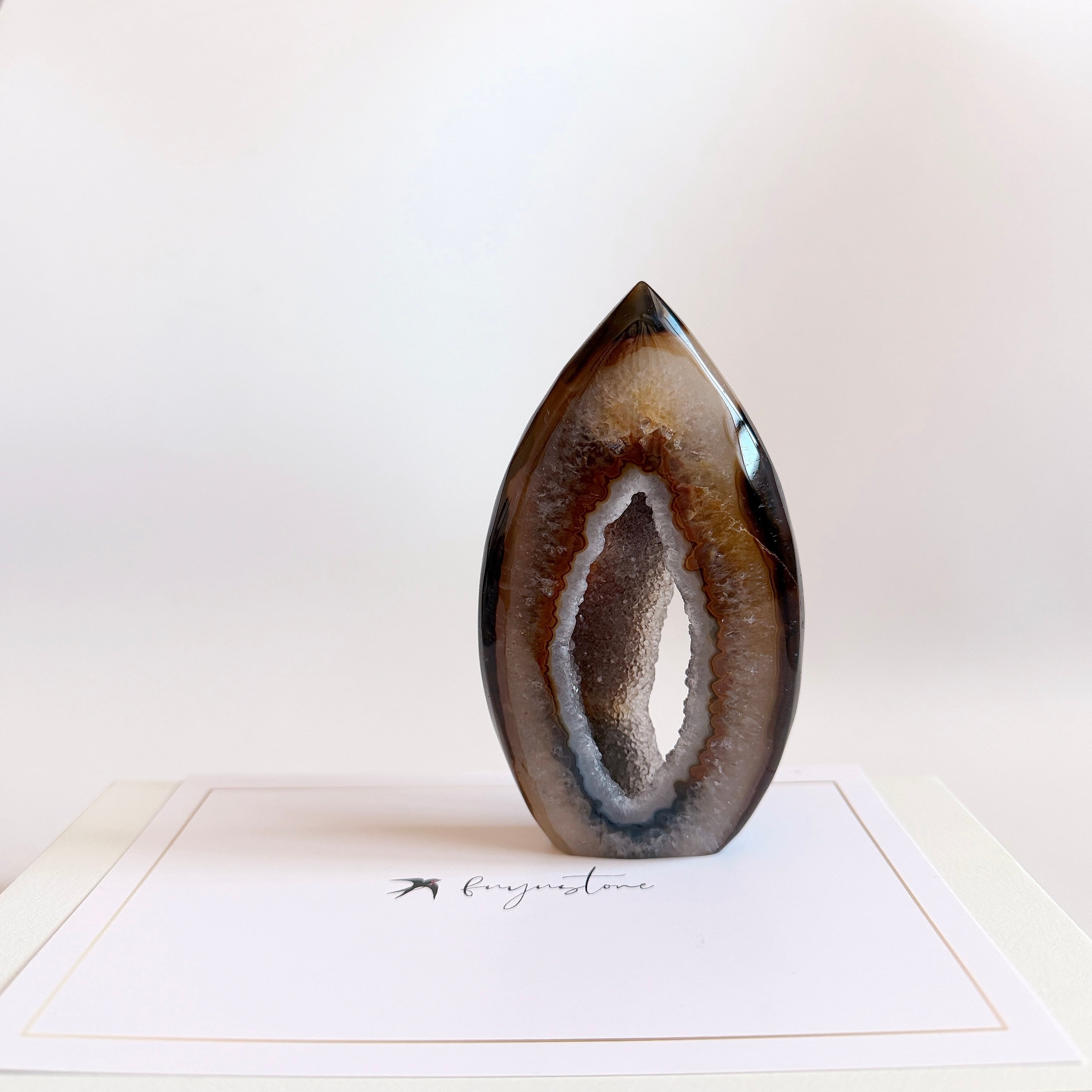 中央がジオードになっているフレイム(炎型)タイプのデザインで、インテリアに取り入れやすいブラウン×グレーの落ち着いたカラーです。