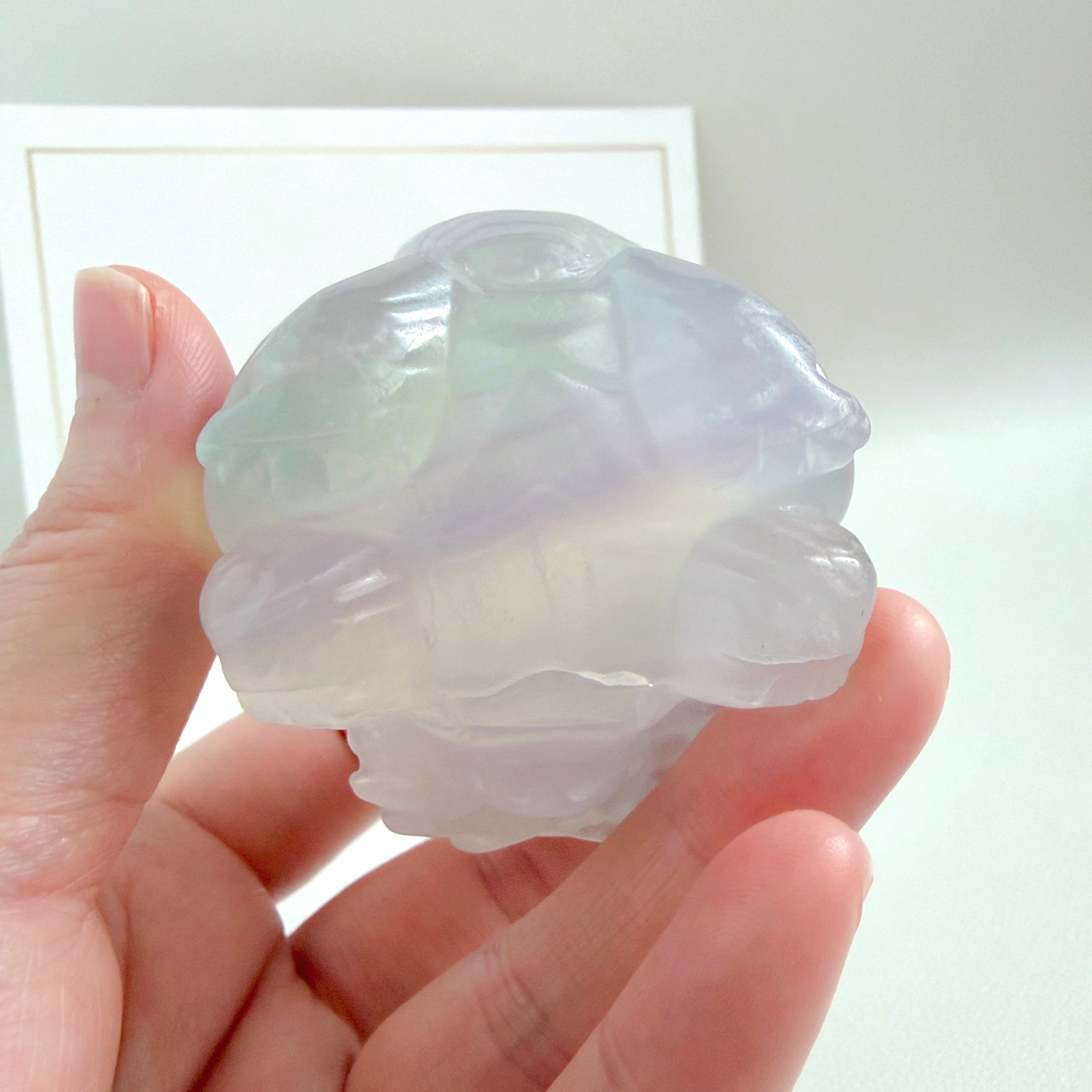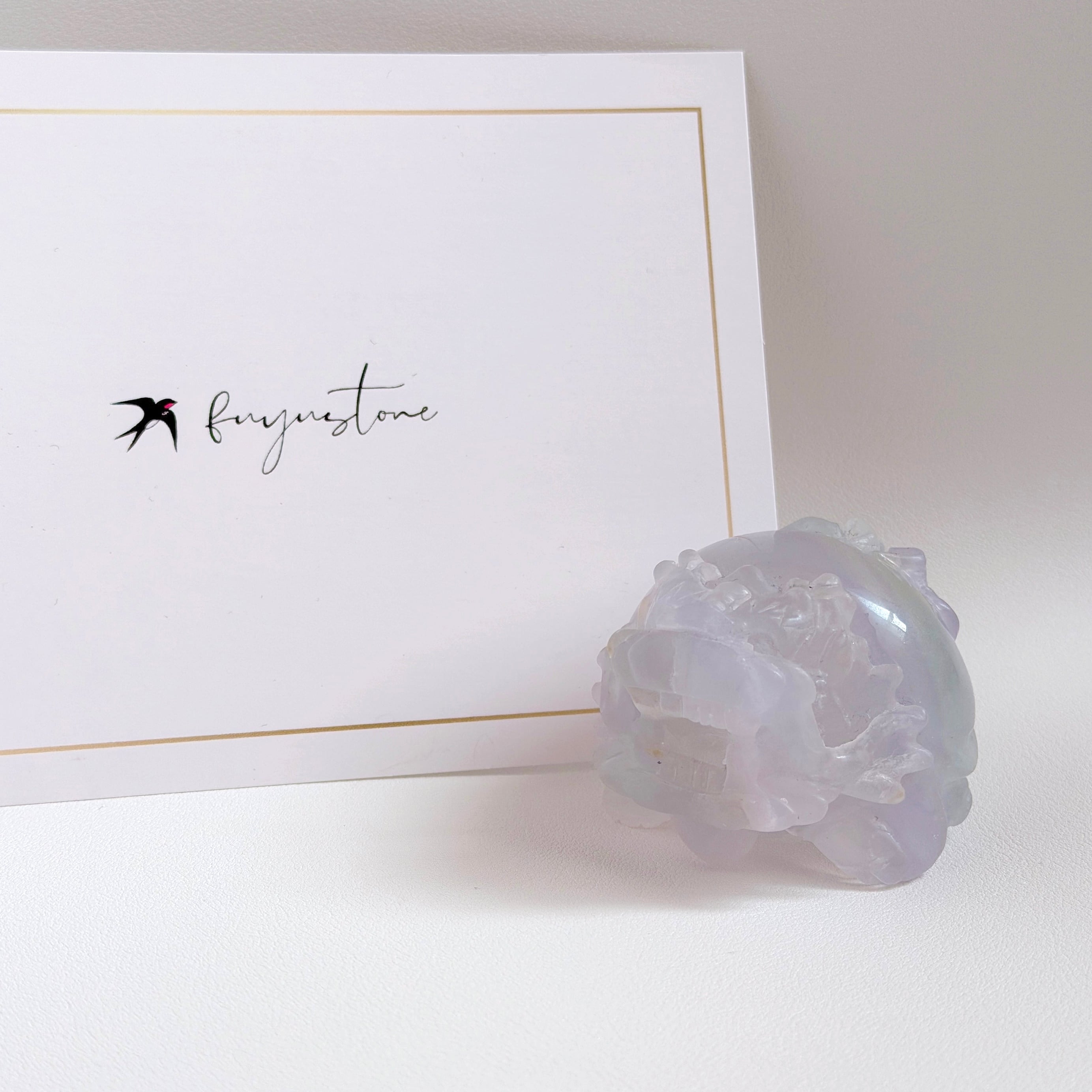 フローライトの瑞々しく透明感あふれるエネルギーを纏った、稀少なロングイ(龍亀)のカービングです。