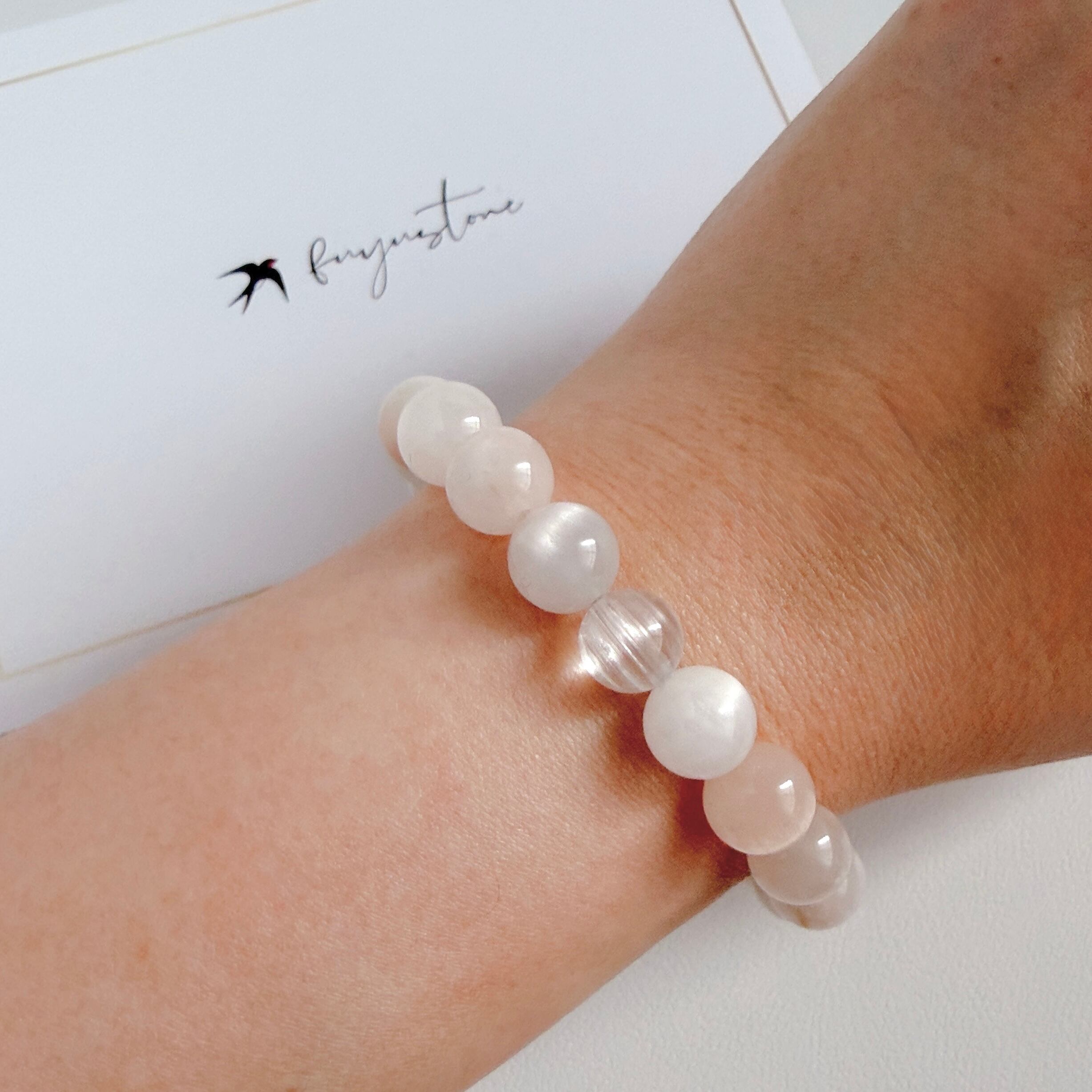 ロゴチャームは、高品質のステンレス素材を使用しております。ブレスレットのゴムは、全て透明シリコンゴムを使用し、結び目をボンドで固定せず、石の中に入れております。石に優しく、アフターケアやメンテナンス時に石をばらして浄化しやすい仕様です。万が一、結び目が出てしまった場合は、優しく石をずらしながら、結び目を石の中へ戻してください。