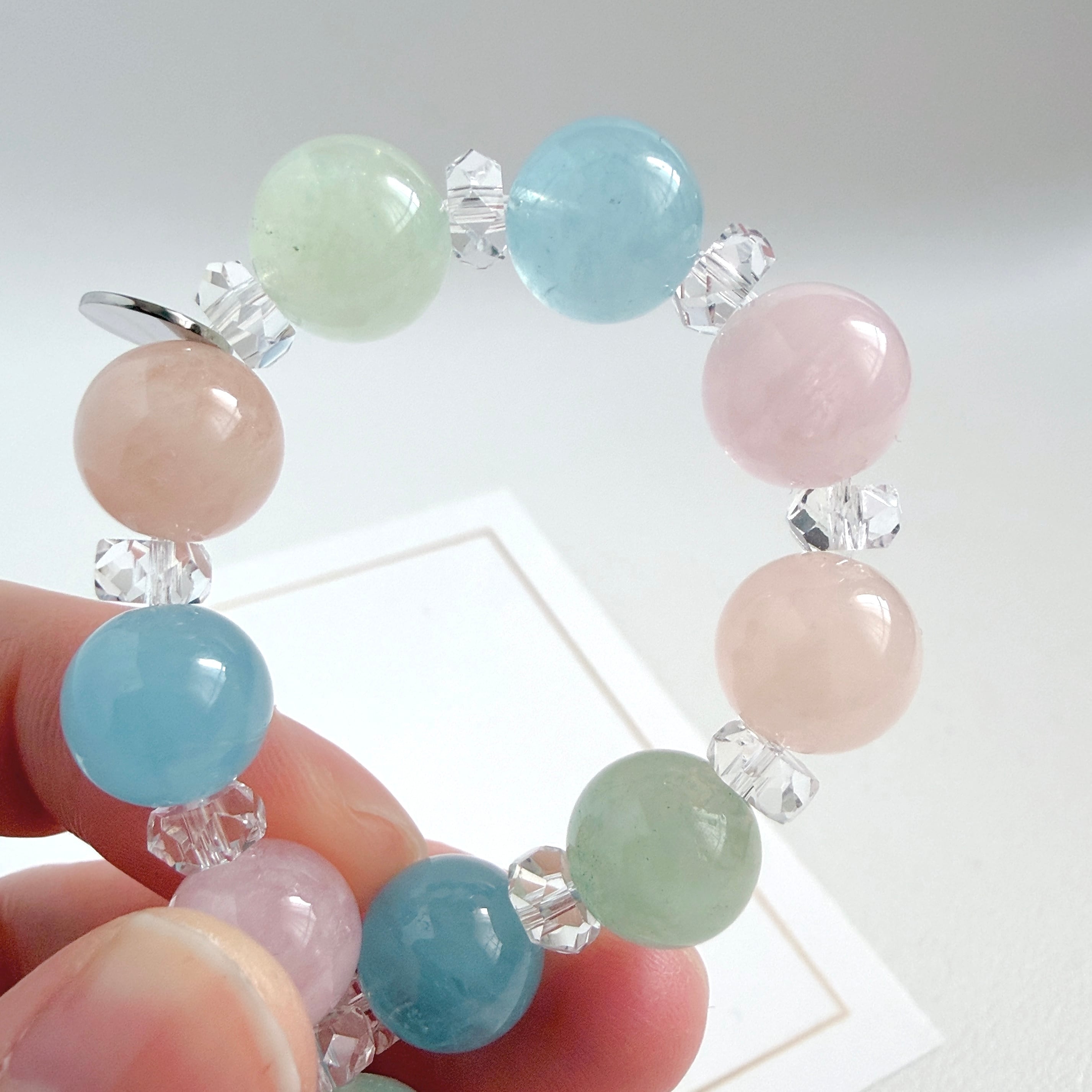 ぷるんとした艶やかな輝きと、透明感とミルキー感が美しい、モルガナイト、アクアマリン、エメラルドの3種類のクリスタルをひとつに束ねた、ミックスベリルのブレスレットです。