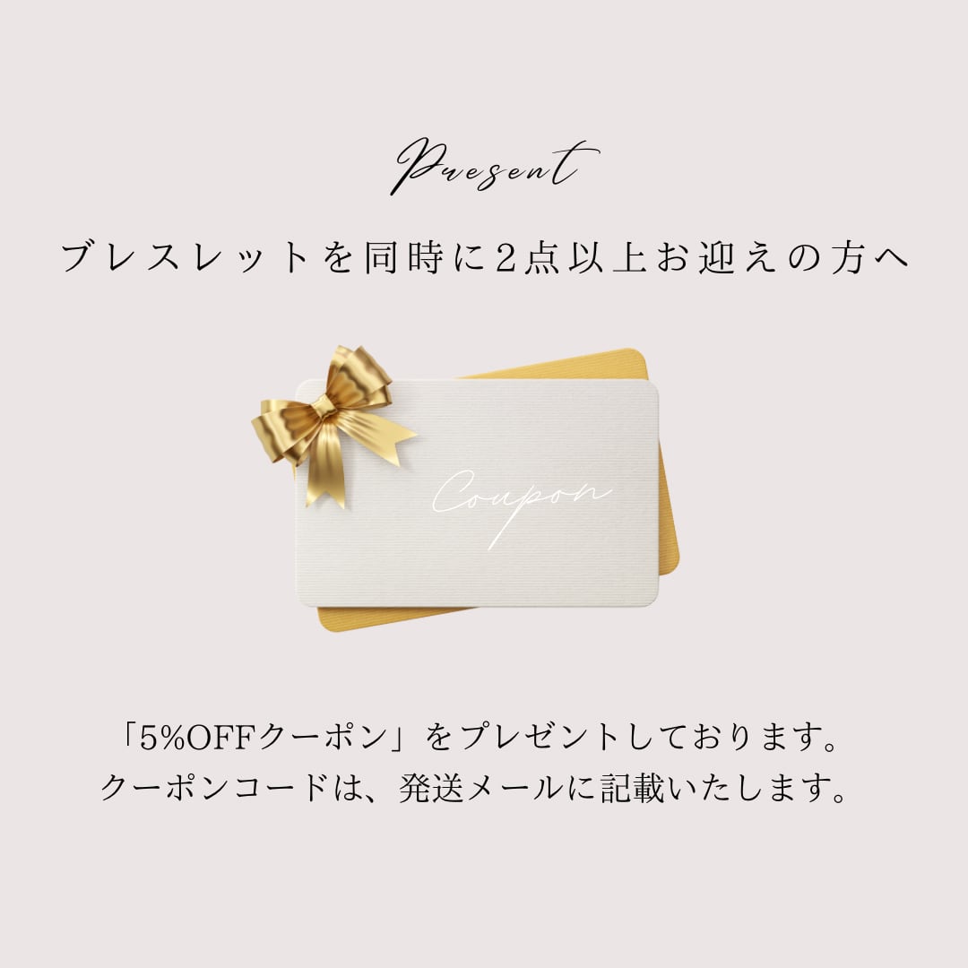次回ご利用いただける「5%OFFクーポン」をプレゼントいたします。ご購入日から2ヶ月間有効のクーポンです。クーポンコードは、発送メールに記載しますので、@basemail.jpの受信許可をお願いいたします。発送メールが確認出来ない場合は、お気軽にお問い合せください。