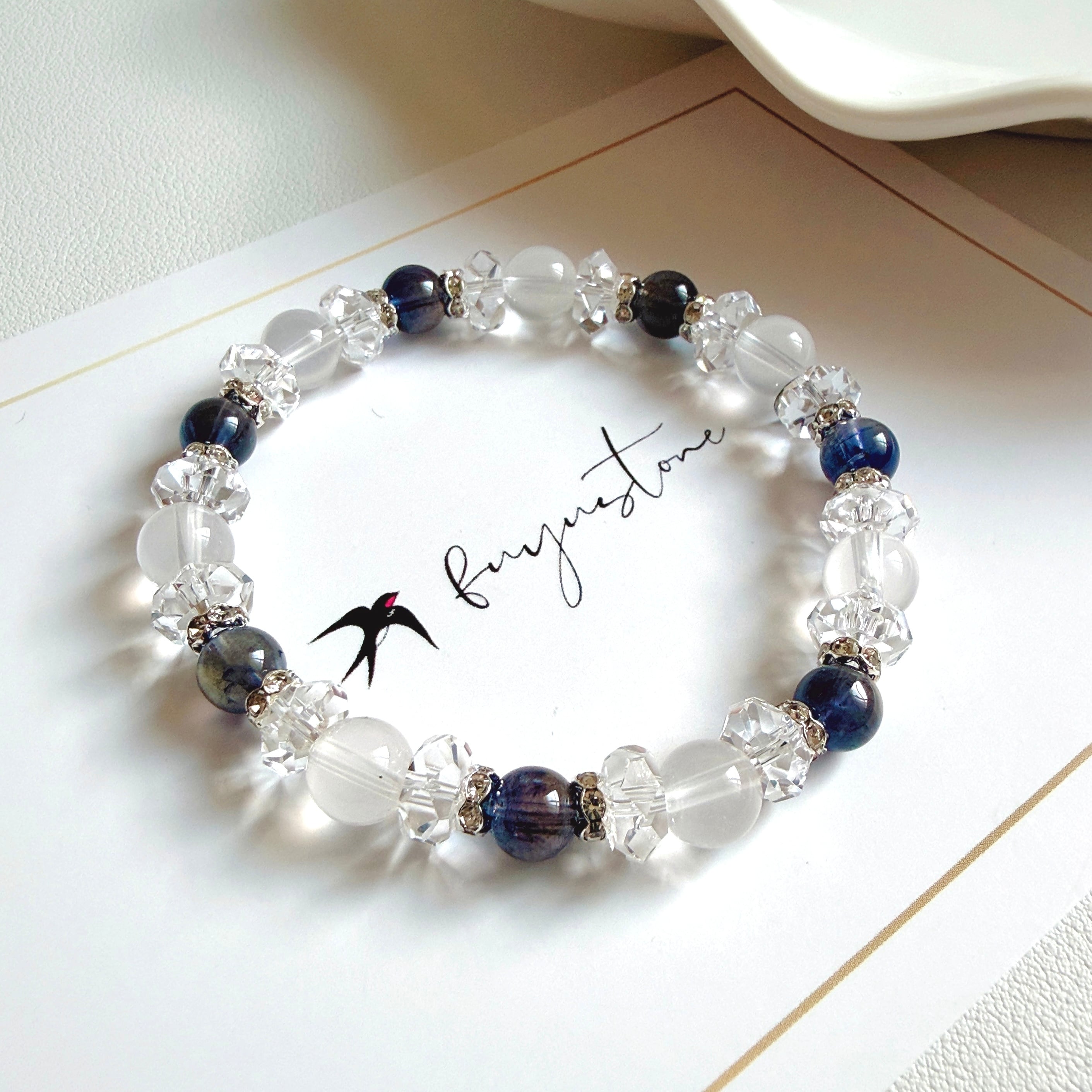 ロゴチャームは、高品質のステンレス素材を使用しております。ブレスレットのゴムは、全て透明シリコンゴムを使用し、結び目をボンドで固定せず、石の中に入れております。石に優しく、アフターケアやメンテナンス時に石をばらして浄化しやすい仕様です。万が一、結び目が出てしまった場合は、優しく石をずらしながら、結び目を石の中へ戻してください。